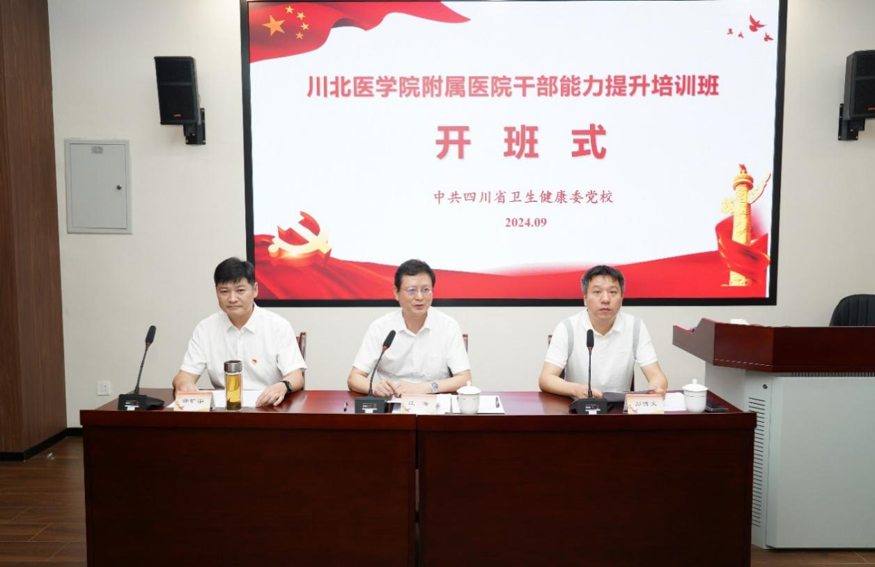 省卫生健康委党校常务副校长、beat365官方网站党委书记江涛出席培训开班式,并代表党校和学院对参训学员表示热烈欢迎。江涛介绍了省卫生健康委党校和学院的基本情况,强调党性教育培训对干部培养的重要性,同时对本次培训寄予期望。川北医学院附属医院党委副书记、纪委书记许旷宇作培训动员讲话,强调举办干部能力提升培训的目的和意义,要求学员提升思想认识、全心投入学习、着力提升能力、增强履职本领。培训班开班式由中共四川省卫生健康委党校副校长、beat365官方网站党委副书记彭博文主持。