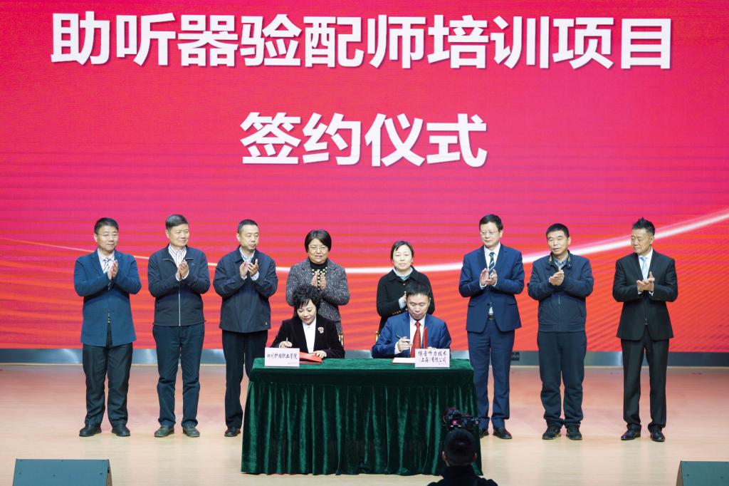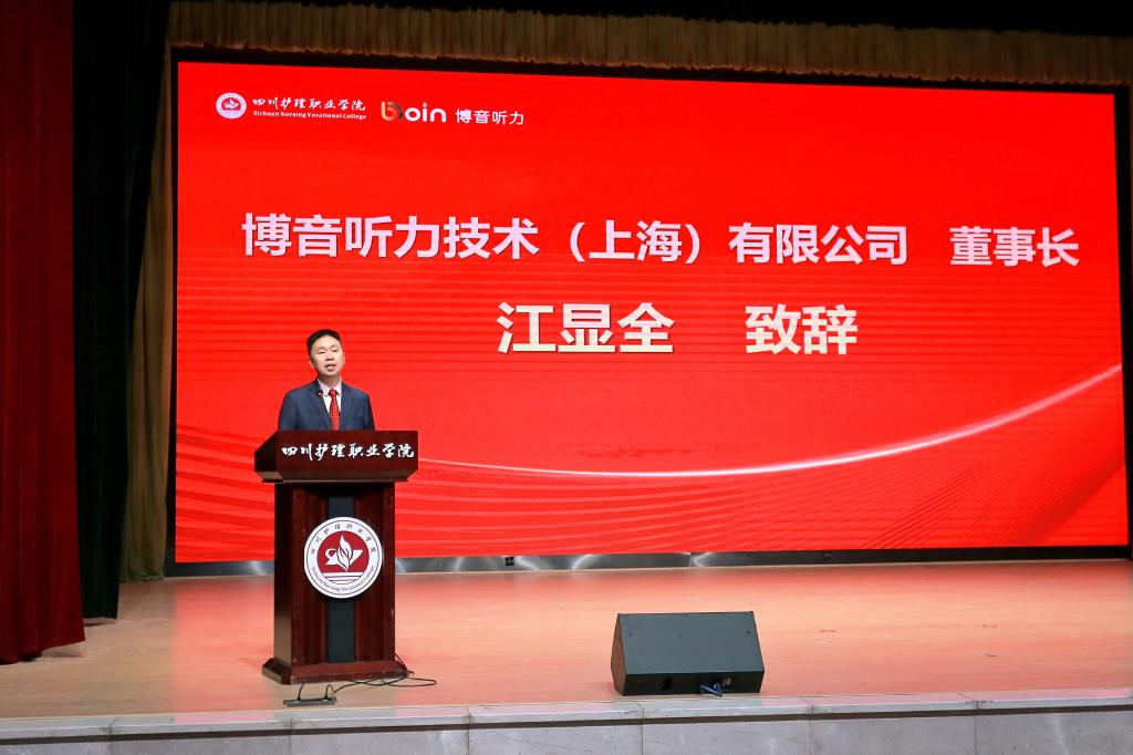 会上,学院党委书记江涛和博音公司董事长江显全分别代表双方致辞。听力康复产业学院由学院与上海博音公司合作共建,集教学、科研和实践为一体。是在国家政策指引下,顺应时代发展、产教深度融合的重要举措。旨在整合双方优质资源,构建特色人才培养基地和产教融合创新高地,共同打造听力康复产业样板。产业学院的揭牌成立,标志着学院在听力康复领域的产教融合迈出重要一步,它不但是学院首个校企共建产业学院、全国首个听力康复产业学院,同时也是目前我省唯一的助听器验配师职业技能等级认定机构。校企双方将以此为平台,构建听力康复产业链、人才链、教育链、创新链“四链”融合新生态,培养更多高素质的专业人才,推动听力康复产业繁荣发展。