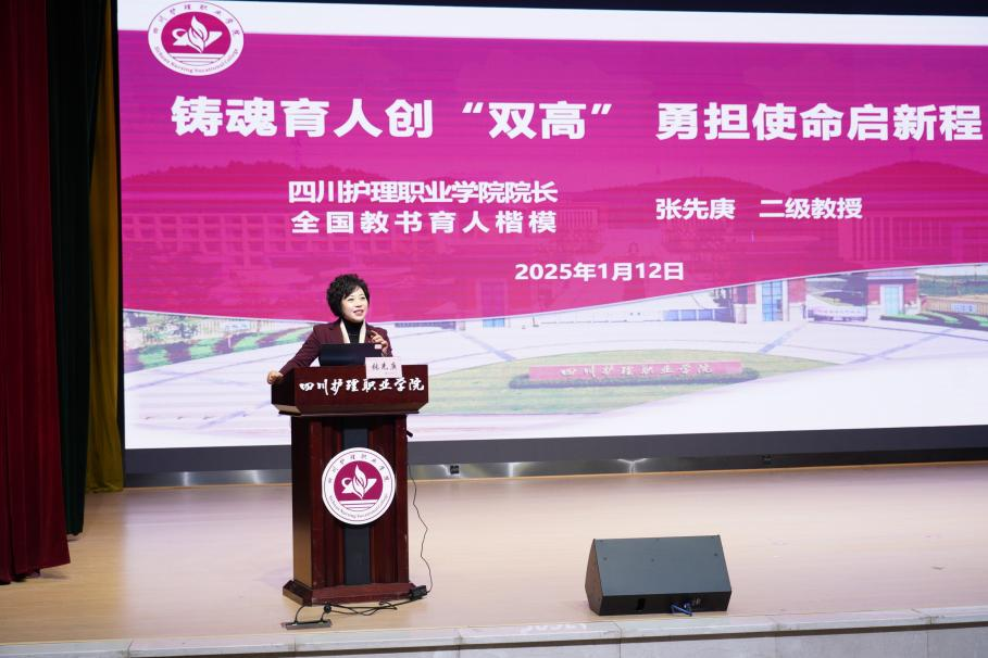 张先庚教授以铸魂育人创“双高”,勇担使命启新程为题,围绕“新双高”建设是什么、怎么做,深入解读了“新双高”计划的时代背景、政策动态和建设思路,深入剖析了学院近年来在开展“双高”计划建设的核心抓手——产教融合的建设现状、取得的业绩和存在的困惑问题。她聚焦学院“1235”发展战略和“新双高”建设目标,聚力现代职业教育体系建设改革要求,结合学院、国家、社会与行业现状与发展,高屋建瓴地提出建设思路、行动举措与发展愿景。她强调,全体教职工要凝心聚力谋发展、奋发有为讲奉献、铸魂育人担使命,争做“五爱五尽”川护人,答好“教育强国”“健康中国”的时代命题,谱写中国式现代化“川护”新篇章!