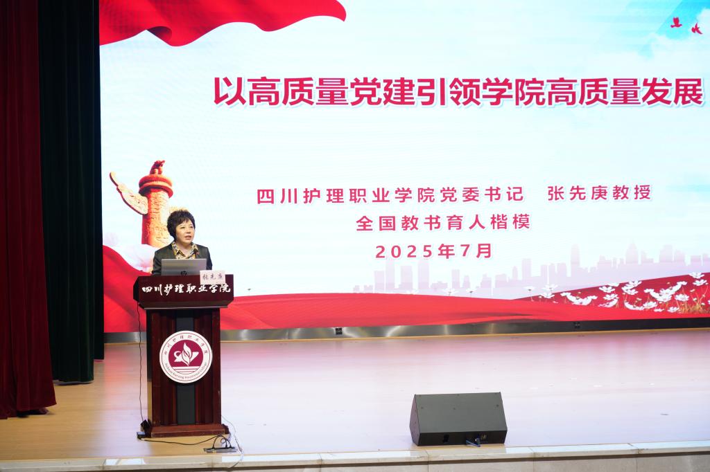 张先庚教授以《以高质量党建引领学院高质量发展》为题,全面总结学院上半年工作亮点,结合职教政策客观分析当面面临的严峻形式和挑战。她强调,要以加强基层党支部建设为抓手,全面推进党建与业务深度融合;要以“强专升本”为目标,对标开展“铸魂领航”党建项目培育工程;要坚持“五个突出”,选优配强新一届干部队伍;要强化师德标兵”引领作用,打造一支高素质专业化教师队伍。全体教职工要乘势而上、真抓实干、阔步前行,以实际行动回答好“强国建设川护何为”的新时代之问。