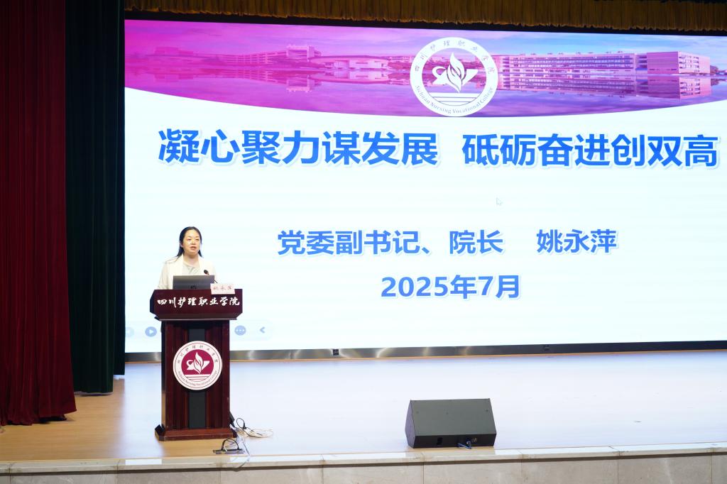 会上,院长姚永萍教授作题为《凝心聚力谋发展 砥砺奋进创双高》专题报告,她从“新双高”实施背景开篇,指出学院内涵建设存在的问题,明确下一步建设思路及规划展望。要求全院教职工要凝心聚力,聚焦“作风建设”,立规矩、强担当、提效能,实现“双高建设”目标;要对标对表、凝聚力量、决战决胜,攻坚“双高建设”关键期;要固本培元、守正创新、追求卓越,深化“内涵建设”,争创高水平标志性成果。