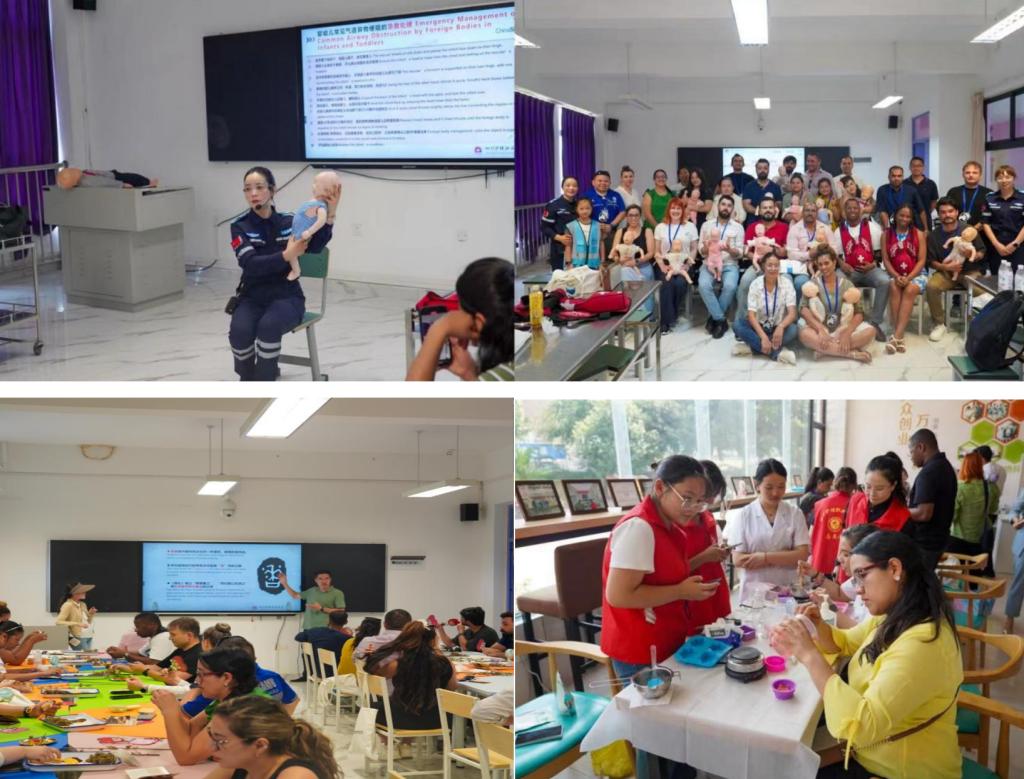 培训期间,学院组织开展了系列高水平专业课程。基础部赵宏贤教授依托3D数字人解剖系统,解析了人体呼吸系统、循环系统、神经系统的关键结构和保护策略。医疗技术系王景教授、陈柯如老师围绕野外急救主题,讲解有毒生物伤害处置、农药中毒处理、创伤急救等知识。护理系曾学燕副教授和赵翠霞副教授分别系统讲解成人心肺复苏技术婴幼儿气管异物梗阻的急救方法,并现场指导学员进行实操训练。药学系和医疗技术系还分别组织了中药香囊和芳香精油皂、耳穴压豆、艾草养生锤制作等中医药和医美文化体验交流活动。