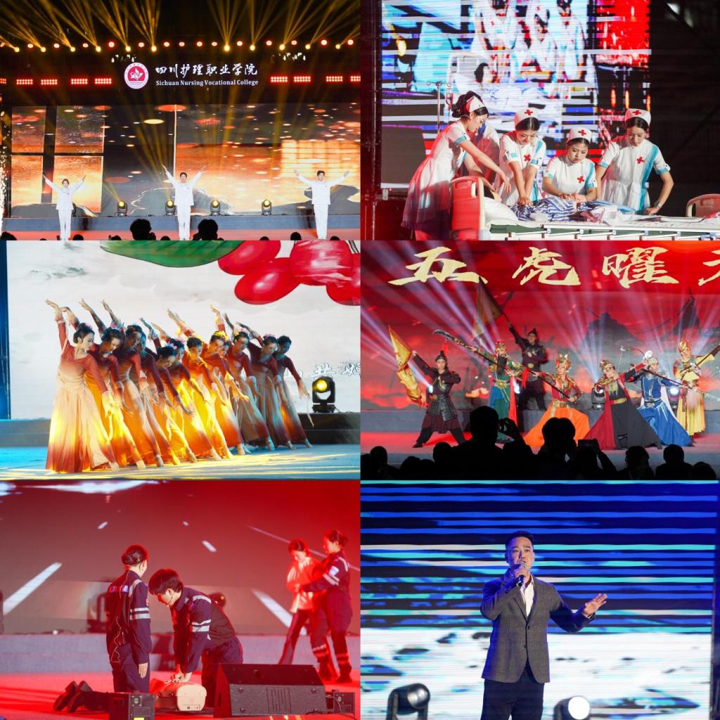 晚会以“启航一淬炼一远行”为主线,通过“启航:仁心初绽”“淬炼:技以载道”“远行:守护星河”三个篇章,生动展现了川护学子从入学求知、技能锤炼到职业奔赴的成长历程。节目融合器乐、歌曲、朗诵、舞蹈等多种艺术形式并将专业展示融入其中,充分彰显了川护师生爱党、爱国、爱校的情怀和丰富多彩的校园文化。舞蹈《新生代,舞所畏》《beggin》活力四射,传递出学子砥砺奋进的青春朝气;歌伴舞《如愿》《五色经纬》唱响了昂扬向上的青春旋律;舞蹈《仁心若水》以优美舞姿演绎了对祖国未来的美好憧憬。各二级学院结合专业特色呈现了精彩节目,智慧护理学院的情景表演《险途救援》、药学院的舞蹈《本草浮光》、医技学院的走秀《光韵面纱》、康复学院的朗诵《前行的答案》,均以艺术化形式展现了学子们对医学专业的自信与热爱。教师独唱《向往神鹰》深情动人,将现场气氛推向高潮。历时近一个半小时的晚会,在民族地区学生表演的歌舞《山水同脉,医路同心》中圆满落幕。
