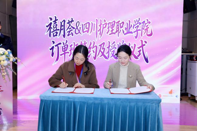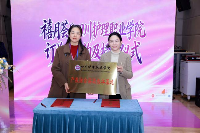 活动现场,姚永萍代表学院与成都禧月荟母婴护理服务有限公司签订了订单班合作协议,并与谢泽涵共同为“beat365官方网站产教融合实践教学基地”揭牌。