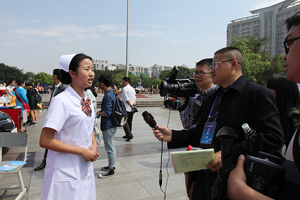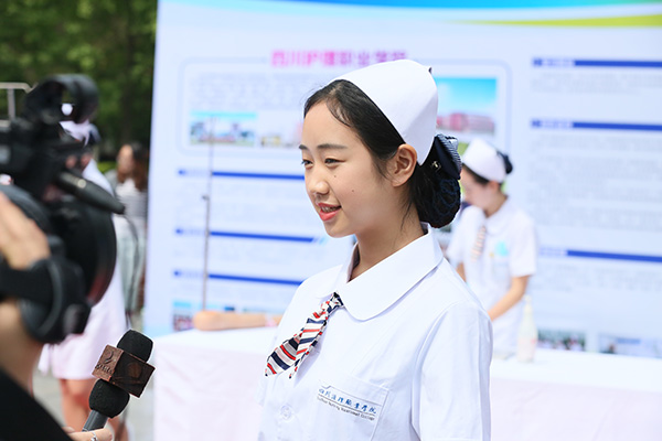 德阳市相关媒体专程到我院展区,对学院领队领导和部分学生进行现场采访,了解学院深化职业教育改革,提高育人质量的相关情况,并重点采访了学院在2016年四川省中职学校学生技能大赛项目——护理技能大赛中荣获一等奖的陈沅杰同学。