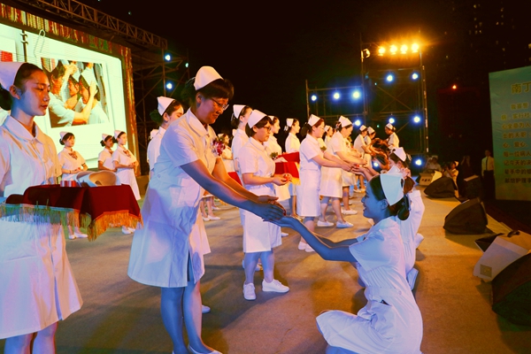 期间,护士生授帽、授烛和宣誓仪式,掀起晚会沸点。学院领导和护理专家为即将踏上护理道路的同学戴上圣洁的燕帽,共同见证了她们投身护理事业的成人洗礼。“授烛”仪式则意喻护理前辈将“燃烧自己,照亮别人”的精神将传递到新一批护士手中。宣读南丁格尔誓言的宏亮声浪,净化着每个人的心灵,使整个活动现场显得庄严而神圣,让每一个人都深深感受到护理工作的崇高和光荣、责任和奉献。最后,晚会在大合唱《护士之歌》中落下帷幕。