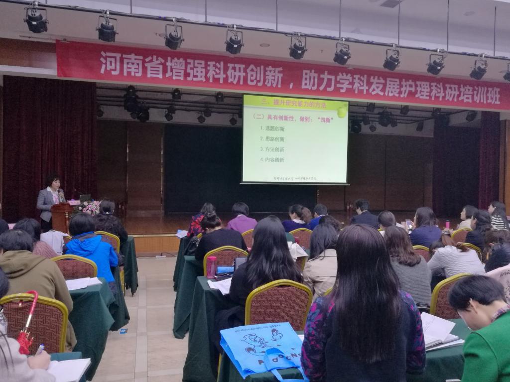 2018年4月12-13日,由河南省护理学会主办的“增强科研创新, 助力学科发展护理科研培训班”在郑州市开班。河南省护理临床教学科研工作者500余人参加培训。培训由郑州大学护理学院院长张振香教授和河南中医药大学护理学院副院长秦元梅教授主持,由四川省护理学会副理事长、beat365官方网站院长张先庚教授和浙江大学生物医学工程系邓宁教授等分别做护理科研选题与设计、医学信息技术在护理和慢病管理中的应用专题培训。