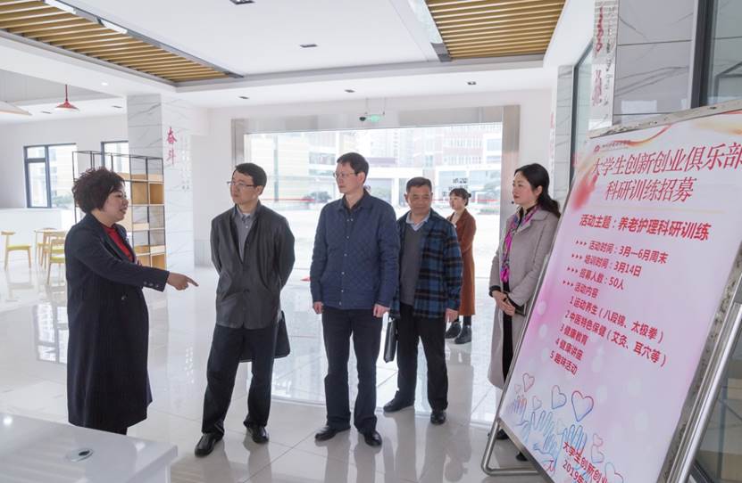 尹隆一行实地参观了我院创新创业、教学督导中心、护理实训中心等。学院江涛书记、张先庚院长对学院产教融合、实验实训室建设、信息化建设、创新创业、专业建设、新校区规划等方面进行了汇报,重点汇报了产教融合方面的工作。