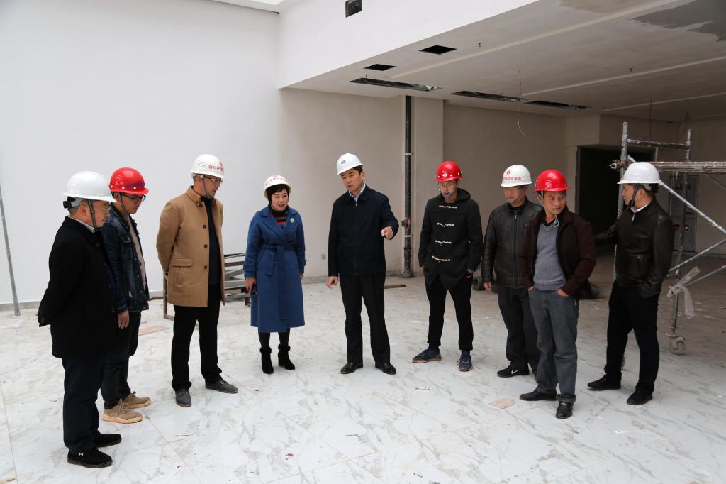在图书馆馆施工现场,强调指出图书馆是学院的标志性建筑,同时是大学文化建设的重要基地,馆内文化建设、学风建设等方面要凸显特色。