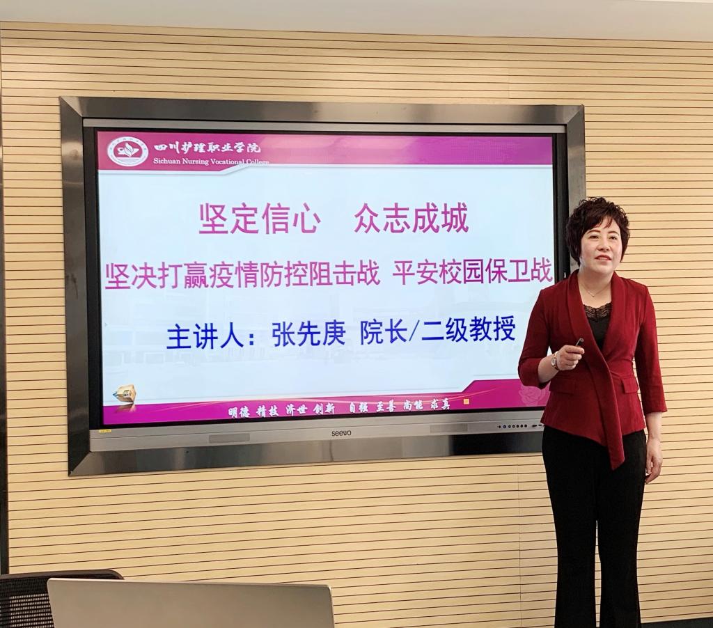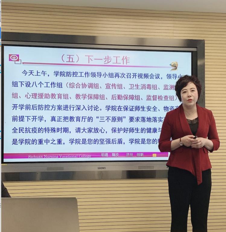 张院长重点介绍了学院防疫工作情况及下一步工作安排。自新冠肺炎疫情暴发以来,学校党政高度重视,坚决贯彻落实学习党中央、省委、省政府及各级主管部门的决策,学院对疫情防控工作进行统一领导、全面部署,始终把好“五个关”、落实“日报告”、“零报告”制度,为师生守好校园这片净土,确保师生生命安全。同时,介绍了组建 “beat365官方网站新型冠状病毒肺炎爱心志愿队”,130名志愿者在抗疫最需要的社区充分发挥卫生健康专业优势,为龙泉驿区12万人和全院师生开展平台网络服务和健康宣传防护,彰显川护社会担当。随后,张院长向大家传达了近期《四川省教育系统防控新型冠状病毒感染肺炎疫情确保开学安全的工作预案》,学院也将坚持疫情响应不解除师生不返校,物资保障不充分不开学,防控措施落实不到位不开课,真正把省教育厅的“三不原则”要求落地落实落细。对师生“停课不停教、停课不停学、学习不延期”,保证疫情防控期间教学进度和教学质量做相关安排和要求。