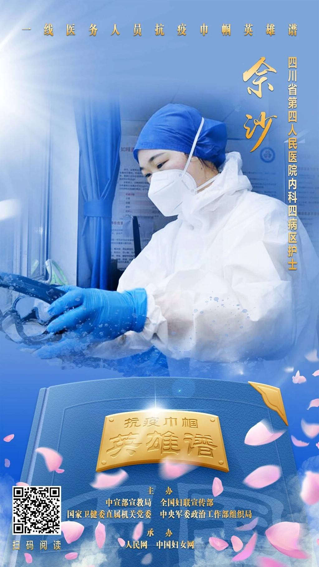 3月7日,中宣部宣教局、全国妇联宣传部、国家卫健委直属机关党委、中央军委政治工作部组织局通过人民网、中国妇女网联合发布“一线医务人员抗疫巾帼英雄谱”。我院学子、四川省第四人民医院内科四病区护士佘沙上榜。