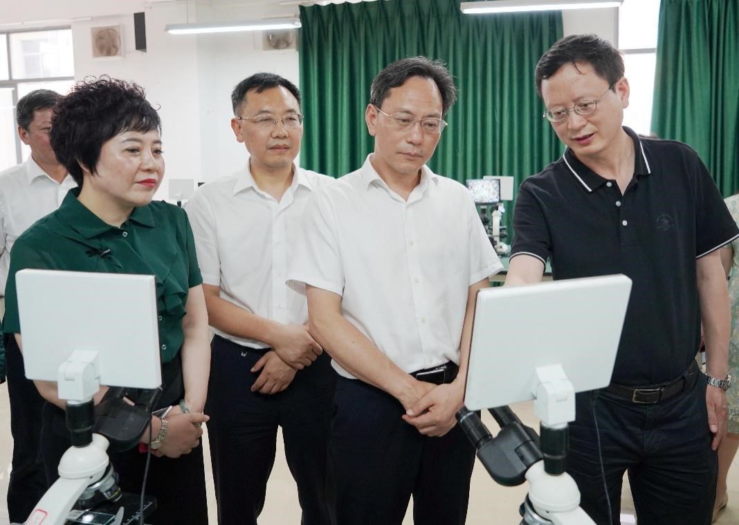 随后,李江厅长一行参观了学院智能化实验室,重点了解了我院3D数字人解剖系统、双目体式显微镜实验室等建设情况,体验了课后学生自主学习实验平台功能。学院开放型实验室和智慧课堂建设给调研组一行留下了深刻印象。