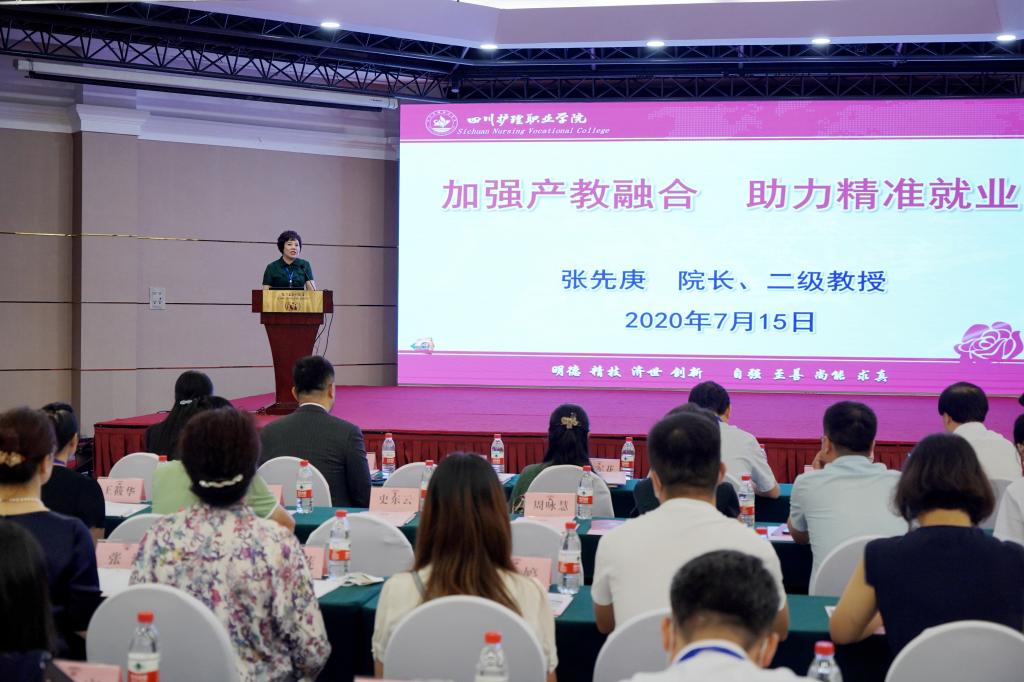 学院院长张先庚重点介绍了学院在产教融合与就业创业工作中取得的各项成绩。张先庚介绍,学院将就业工作作为“生命线工程”,学院党政齐抓共管,多措并举、多渠道促就业。近年来,毕业生受到用人单位的充分认可,与学院建立就业创业友好用人单位占总数的96.88%。她强调,进一步深化产教融合,能够促进教育链、人才链与产业链、创新链有机衔接,全面提高学院教育质量、扩大就业创业,促进校企深度合作,实现“资源共享、人才联动、互利共赢”目标。学院将继续坚持“五大强校”战略,携手各用人单位构建校院企协同育人新机制,共同培养“学得实、下得去、留得住、用得上、干得好”的高素质技术技能健康服务人才,以促进就业为导向、以产教融合为路径,实现校院企互利共赢、共同发展,为健康中国、健康四川做出应有的贡献。