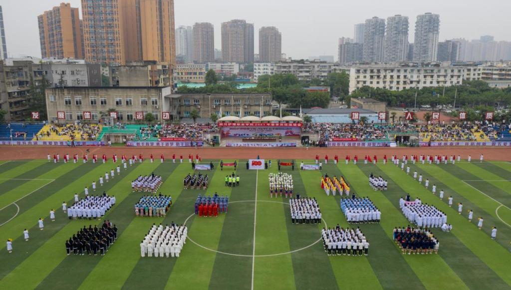 方队中,庆祝建党100周年的展架格外耀眼,与看台上24面彩旗交相辉映;花环方队的同学们身着雪白的护士服,手捧100束向日葵礼赞祖国;旗帜方队挥舞红旗,用青春的身影诉说赤子之心。各方队的表演积极阳光,形式多样,啦啦操、八段锦、武术、花式篮球等闪亮登场,展现出川护学子激情满怀、自信昂扬的精神风貌。