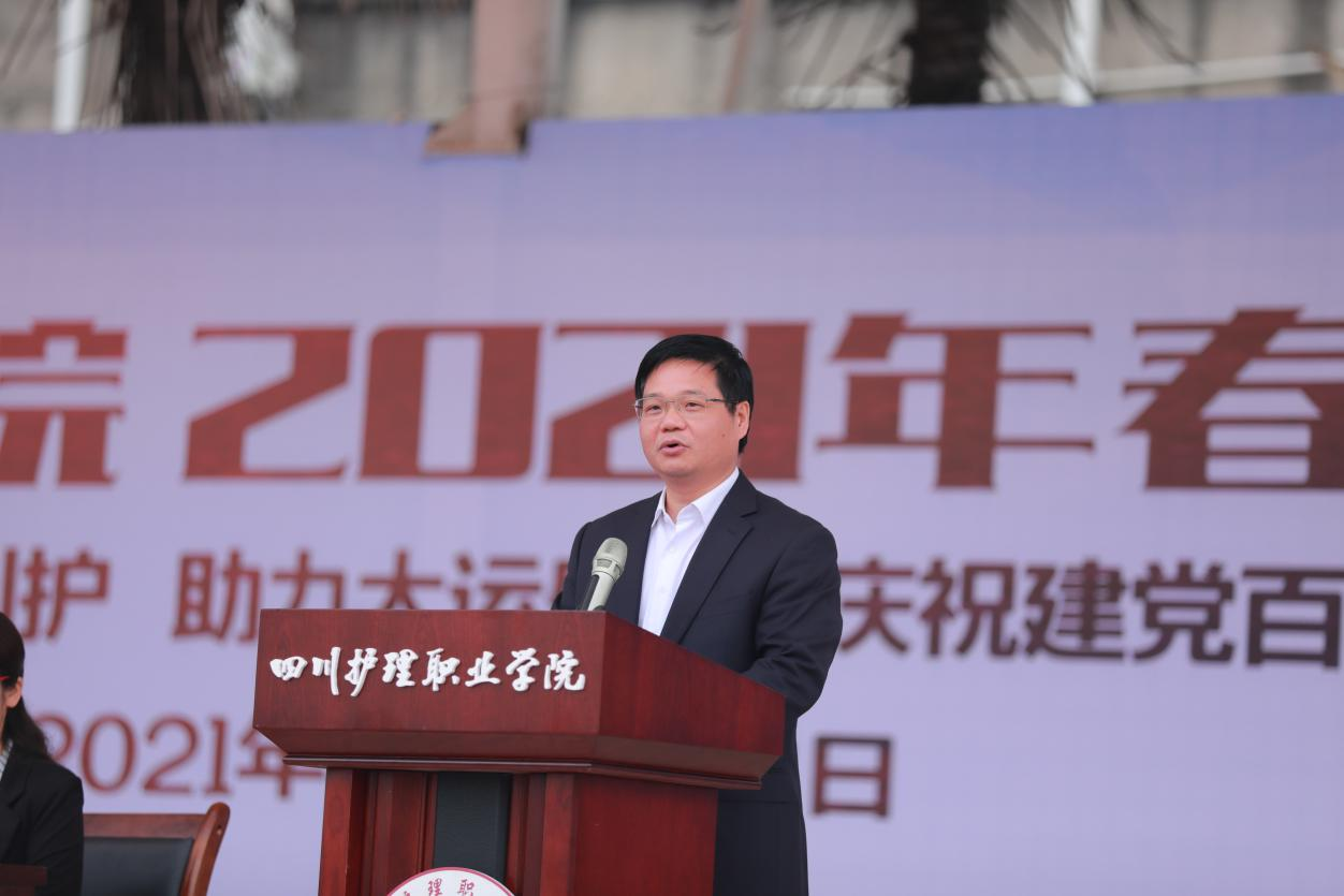张先庚院长在开幕式上致辞,她指出,在学院奋进“十四五”、建设“双高”的征程中,要积极转变“唯体质”或“唯技能”的传统课程观念,确立“健康第一”的教育思想,坚持“五育并举”的育人理念,将体育教育贯穿大学教育的全过程,切实提高学生体育参与意识与行为,使体育成为学校教育的重要环节和人才培养的有效途径。她提出三点希望,一是运动会要公正规范、安全文明,各参赛队、运动员保持良好状态,裁判员严肃执纪、公正执裁,工作人员各司其职、做好保障。二是广大师生要全心投入、全力以赴,以饱满的精神状态、最佳的竞技水平比出川护人的斗志风采,赛出川护人的精神风貌。三是生命不息、运动不止,全校师生要积极参加体育锻炼,学会坚持,健康快乐,更好投入到生活和工作中去。