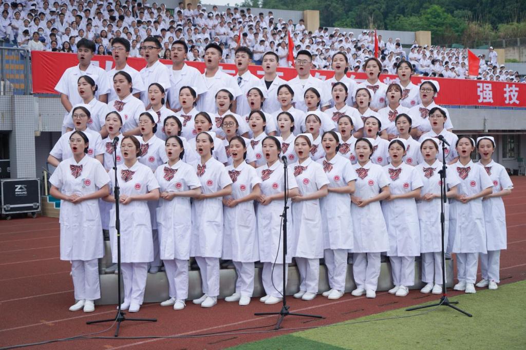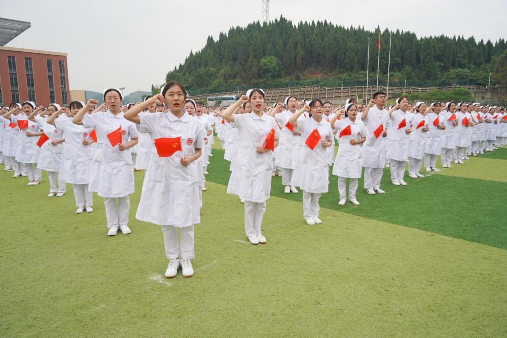 团体操表演“听我说谢谢你”“感恩的心”后,护生们头戴燕尾帽,手拿党旗、国旗,在陶岚的领誓下,庄严宣读南丁格尔誓言。
