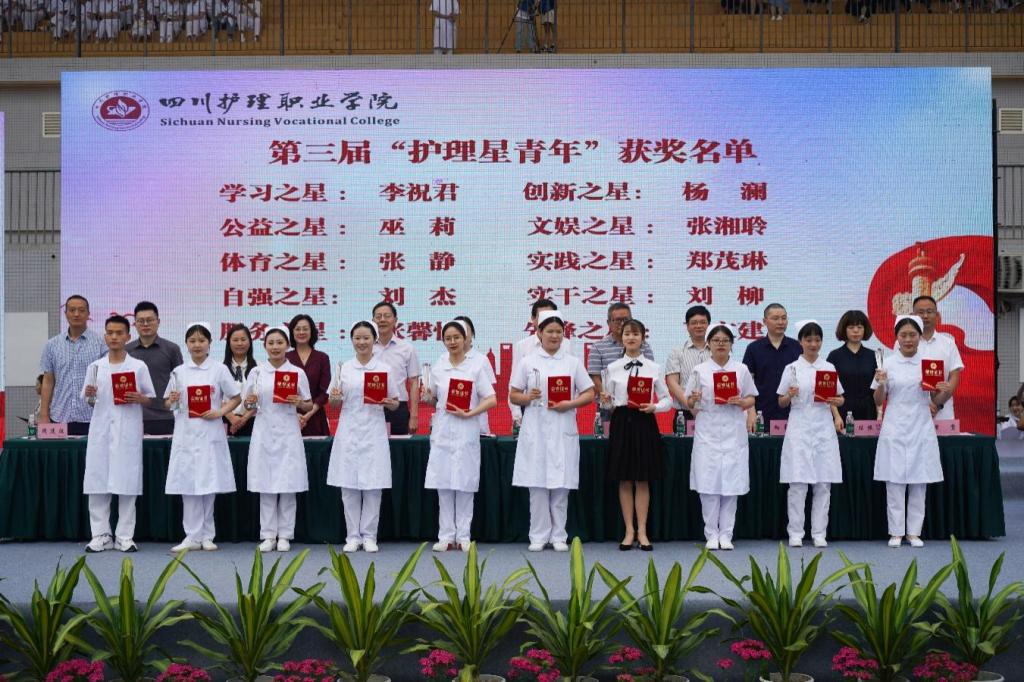 在颁奖环节,活动为前期技能竞赛月系列奖项的获奖者颁奖。护理系选评的学习之星、自强之星、实践之星、服务之星等10名“星青年”上台领奖,影响和带动在场的同学们向评选出的各项技术能手、优秀青年学子学习。