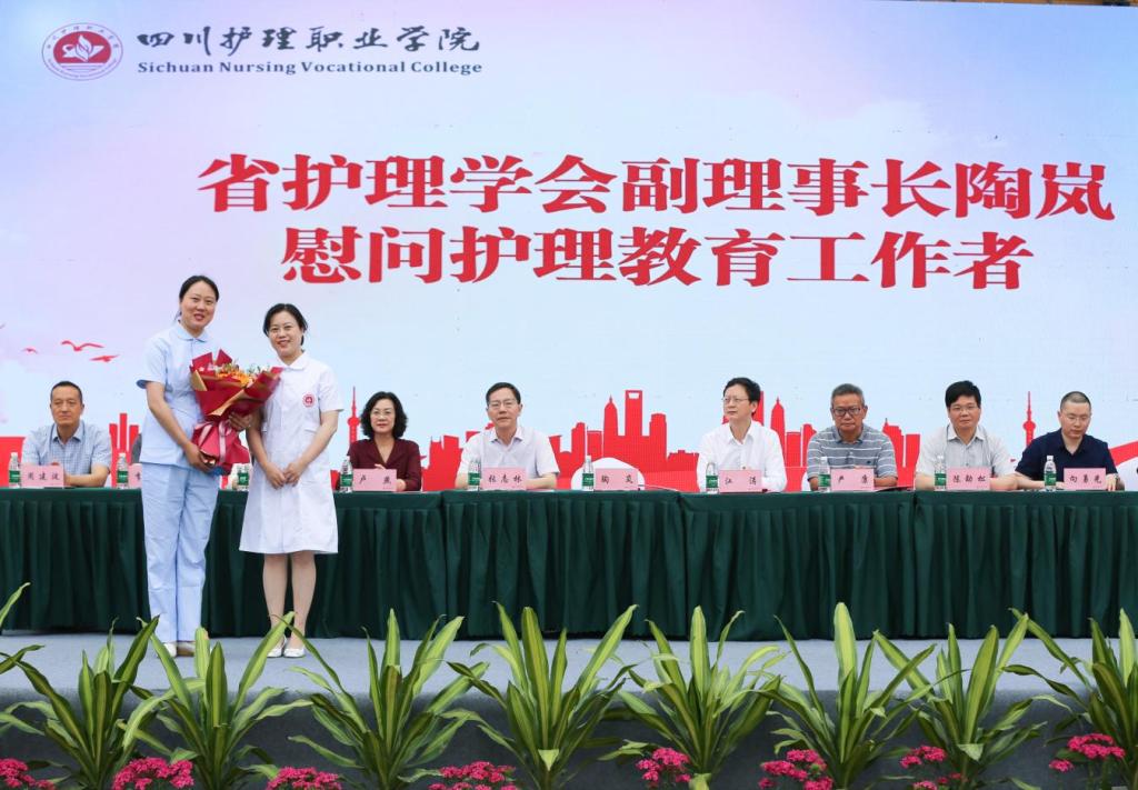 陶岚理事长向辛勤的护理教育工作者致以节日的祝福并献花慰问。
