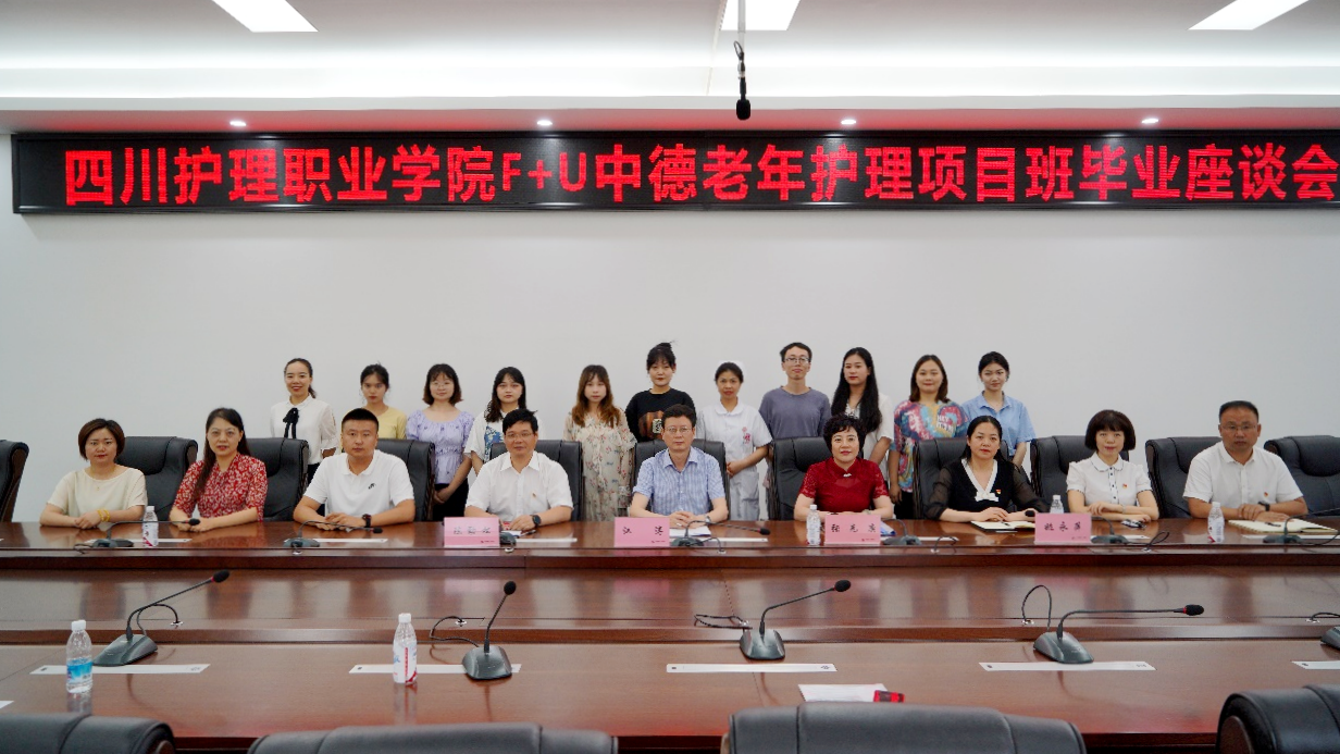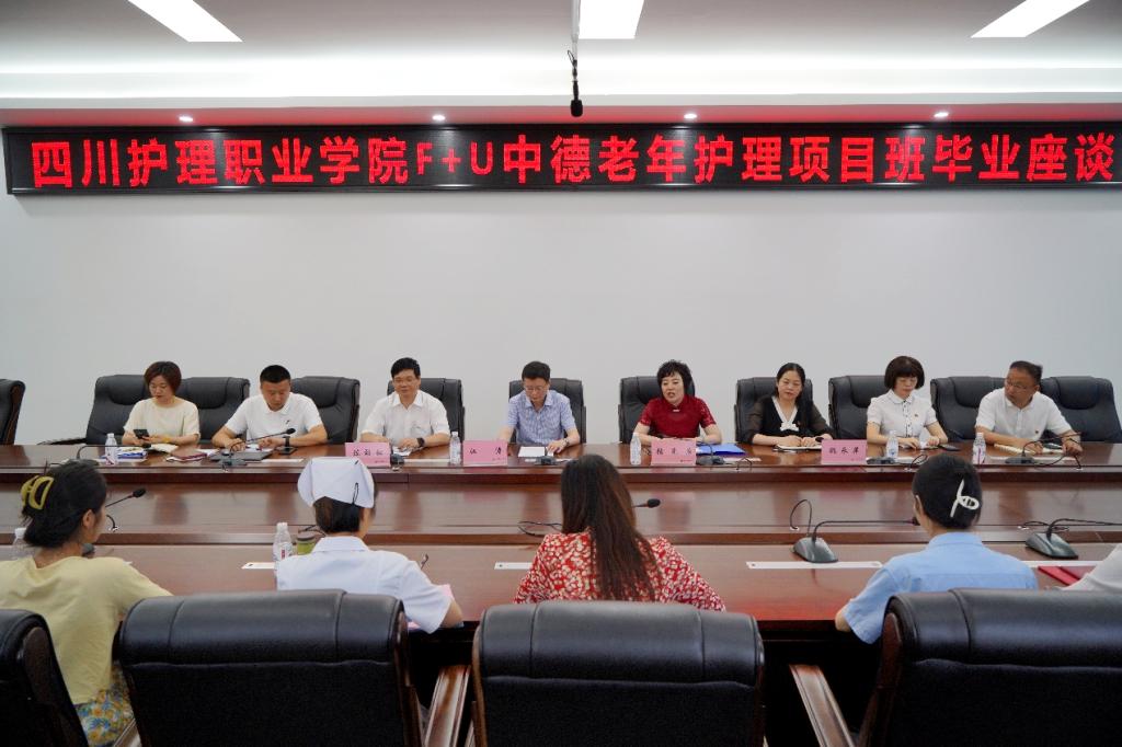 6月29日上午,beat365官方网站2018级德国萨克森州F+U中德老年护理班毕业生代表座谈会在龙泉校区隆重举行。学院党委书记江涛、院长张先庚、副院长陈劲松、姚永萍和护理系、学工部、培训中心等相关部门领导及教学团队代表参加了座谈。