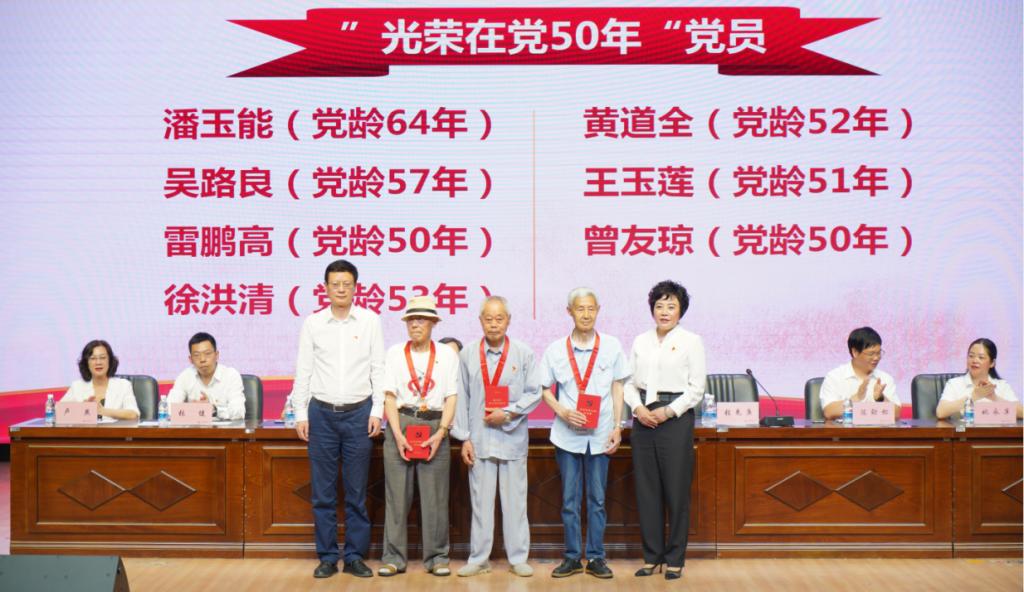 会上,党委书记江涛和院长张先庚向潘玉能、吴路良、雷鹏高3名党龄达到50年的老党员代表颁发“光荣在党50年”纪念章。