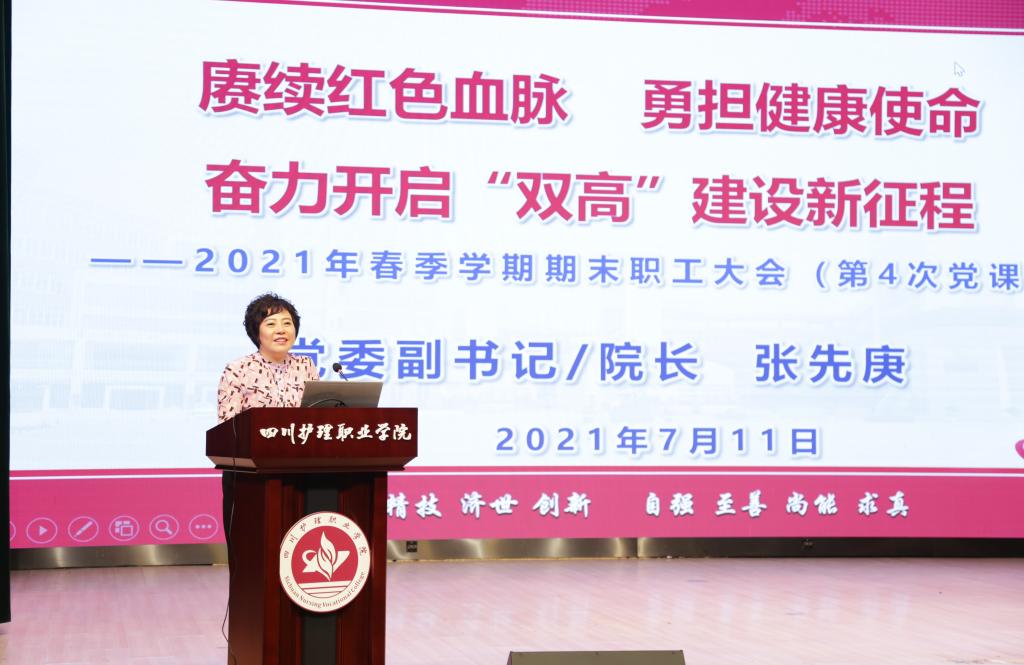 院长张先庚首先结合工作,以“学党史 悟思想 提素质”为主题给全体教职员工上了一堂生动党课。她强调,作为新时代的大学教师和党员干部,必须学党史、悟思想、提素养、抓落实、见成效、促发展,用红色基因培根铸魂,做新时代的追梦人。随后,张院长从绩效工资改革、师资队伍建设、产教融合、“双高”建设、教育教学改革、学生管理、招生就业、内部治理体系等方面,总结了学院春季学期重点工作开展情况及各类改革创新举措,充分肯定了教职工们共同努力下创造的各项成绩。同时,张院长也中肯地指出了一些阻碍学院发展的问题,希望大家坚持以问题为导向,正视问题、解决问题,以更高标准完成秋季学期各项任务。张院长强调,全体教职工要围绕学院中心工作,继续以“五爱五尽”家校情怀为引领,以“五大强校”战略为抓手,实现学院治理体系和治理能力现代化,积极推进“双高建设”,实现学院高质量跨越式发展。