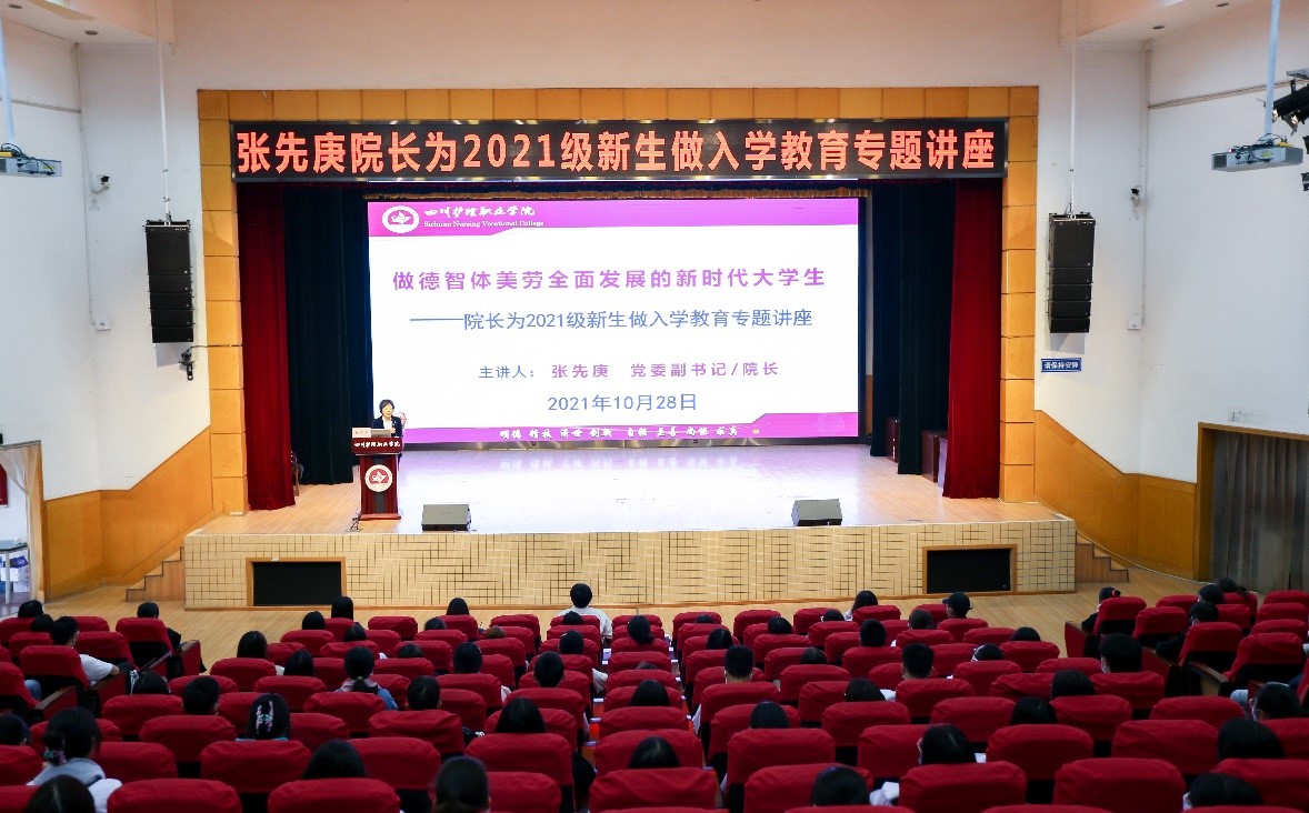 讲座伊始,张先庚院长代表学院全体师生对2021级新生表示了热烈欢迎,详细介绍了学院的发展历程、专业设置、办学定位、办学目标、培养目标、学院文化及取得的标志性成果。她指出,学院始终以学生成长和发展为中心,以“五爱五尽”家校情怀为引领,以“五大强校”战略为主线,以“四有川护人”为目标,培养“学得实、下得去、留得住、用得上、干得好”的高素质实践型技能型卫生健康人才。