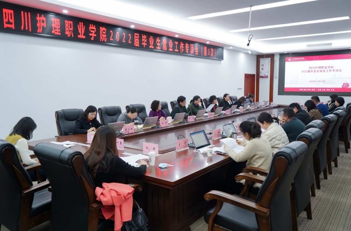 为深入学习贯彻落实党的十九届六中全会精神和2022届全国高等学校毕业生就业创业工作网络视频会议要求,全力做好2022届毕业生就业工作。11月24日下午,学院在成都校区召开2022届毕业生就业工作第三次专项会议。学院党委书记江涛,党委副书记、院长张先庚,副院长姚永萍,省卫生学校副校长卢燕,招生就业处和相关职能部门及系部负责人参加会议,会议由副院长陈劲松主持。