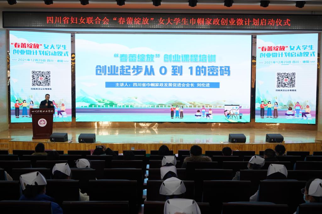 为贯彻落实“六稳”“六保”工作任务,服务成渝经济圈打造高品质生活宜居地,做好女大学生创新创业引领工作,12月29日,由四川省妇女联合会主办,我院与四川省巾帼家政发展促进会共同承办的“春蕾绽放”女大学生创业微计划项目启动仪式在学院德阳校区召开。四川省妇女联合会发展部部长俞惠敏、四川省巾帼家政发展促进会会长刘伦进、德阳市妇女联合会副主席朱军以及我院院长张先庚、副院长陈劲松等有关领导出席会议,四川职业护理学院、雅安职业技术学院等省内高校500余名学生通过线上线下方式参与本次启动仪式。