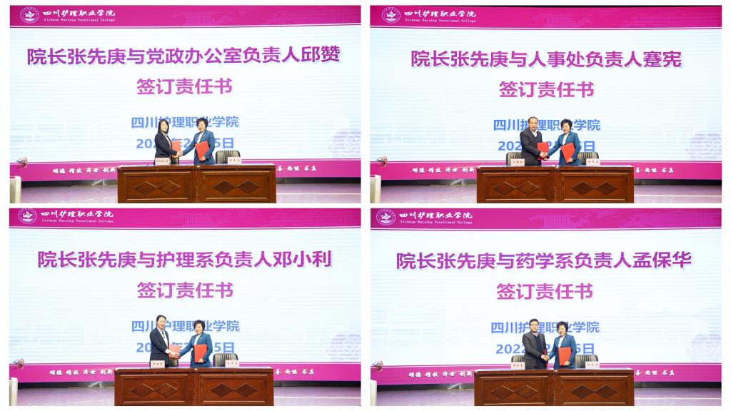 会上,张先庚院长分别与党政办公室、教务处、人事处、护理系等十位“双高计划”建设任务牵头部门负责人签订了责任书,为高效推进学院“双高计划”建设奠定了坚实基础。