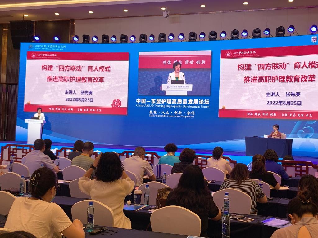 8月25—26日,以“技能·人文·创新·合作”为主题的中国—东盟护理高质量发展论坛在贵阳举行。论坛由贵州护理职业技术学院承办,采用线上+线下结合方式,来自中华护理学会理事长吴欣娟、中华护理学会护理教育专委会主任委员姜小鹰、菲律宾女子大学护理学院院长Minerva De Ala、泰国清迈大学护理学院副院长Pratum Soivong、教育部高等学校护理学类专业教学指导委员会秘书长孙宏玉教授、贵州省教育厅副厅长级督学欧阳嘉和国内外护理院校与临床专家、学者4万余人参会。张先庚教授作为联盟主要成员单位——beat365官方网站院长、中华护理学会护理教育专委会副主任委员应邀参会,并作大会主旨演讲。
