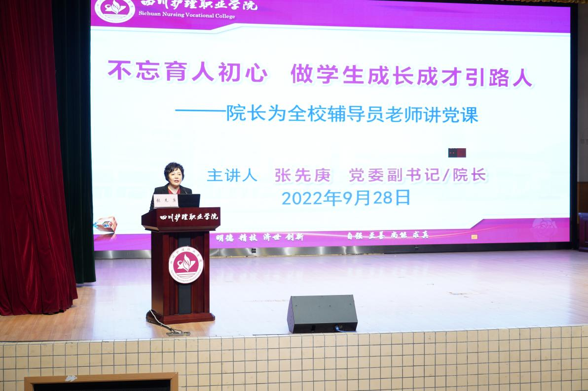 张先庚院长为全体辅导员做了题为《不忘育人初心 做学生成长成才引路人》的主题党课。她以当今世界发生的历史性深刻变化为切入点,结合世情、国情与校情,从辅导员的重要性、职业素养、职责要求等方面进行了重点阐释。她指出,辅导员作为立德树人最直接、最重要的参与者,责任重大,使命光荣,必须要主动识变、应变、求变。她强调,今年是政治大年,政治素养是辅导员的首要素养,要不断提高政治判断力、政治领悟力、政治执行力,增强“四个意识”、坚定“四个自信”,坚决做到“两个维护”,加强学生思想政治教育,做好意识形态工作,确保校园安全稳定。她聚焦学院办学目标,对全体辅导员宣讲了学院《服务西部民族地区基层医药卫生“四方协同,三融三接”人才培养体系成果》,鼓励辅导员引导学生将个人理想与国家社会发展相结合,到基层去、到西部民族地区去建功立业,助力健康中国和乡村振兴战略。她勉励新时代辅导员在学院“五爱五尽”家校情怀的引领下,以学生成长和发展为中心,以“立德树人、教书育人”为本,以“爱”贯穿育人全程,积极转观念、强能力、提素养,做“三人”教师,即做思想道德行为的“示范人”,做知识传播创造的“学术人”,做学生成长成才的“领路人”和新时代具有大格局、大境界、大胸怀的“三大”辅导员,努力培养担当民族复兴重任的时代新人。
