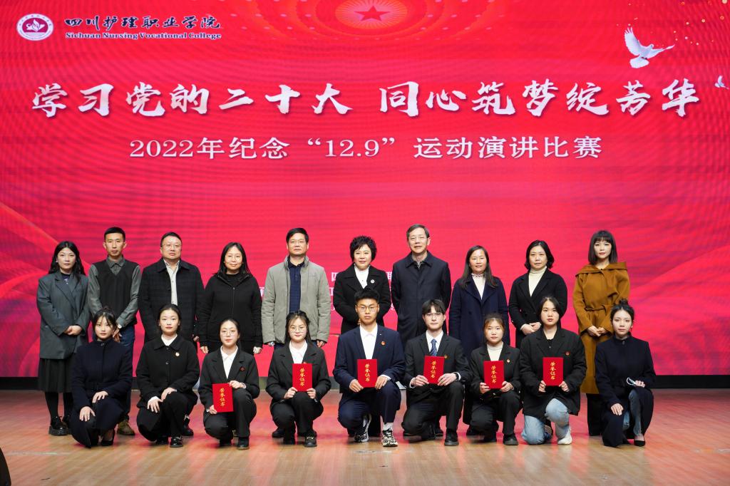 活动结束后,与会领导、老师们与参赛选手们亲切合影。此次比赛,不仅增加了青年学生的爱国情怀,展现了学生的风采,丰富了同学们的课余生活,而且有助于帮助川护学子继承和发扬爱国主义精神,在参与中感受党史教育,在讲述中纪念爱国壮举,勇于承担起振兴中华的历史使命,坚守卫生报国初心,为健康四川、健康中国建设贡献青春力量,为实现中华民族伟大复兴的中国梦不懈奋斗。