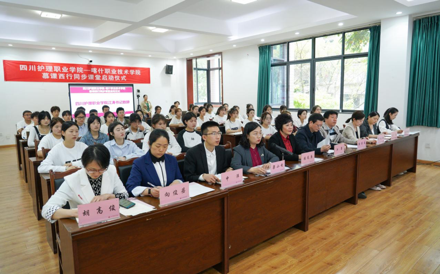在全面贯彻落实党的二十大精神之际,为积极响应教育部“慕课西行”号召,推进优质教学资源共享,实现教育资源均衡,4月13日,依托智慧树在线教育平台,学院40名学生与喀什职业技术学院14名教师和550名护理专业学生横跨3900余公里,共享《老年护理学》精品课程“云端”教学,实现了优质教学资源的互联互通。学院党委书记江涛、院长张先庚、党委副书记彭博文、副院长梁小利和喀什职业技术学院党委书记李怀仁、副院长张世亮及相关部门、系部负责人参加首讲启动仪式。