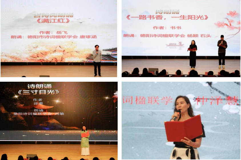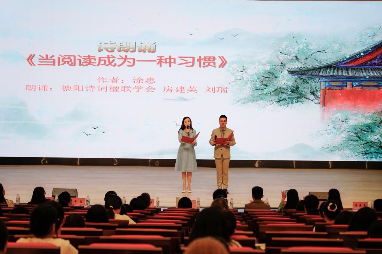 活动中,德阳诗词楹联学会的会员们深情朗诵了岳飞《满江红》、汪国真《热爱生命》等经典诗词和涂惠会长及学会会员原创诗歌《让阅读成为一种习惯》《一路书香,一生阳光》《三寸日光》等,让同学们领略了阅读之美。
