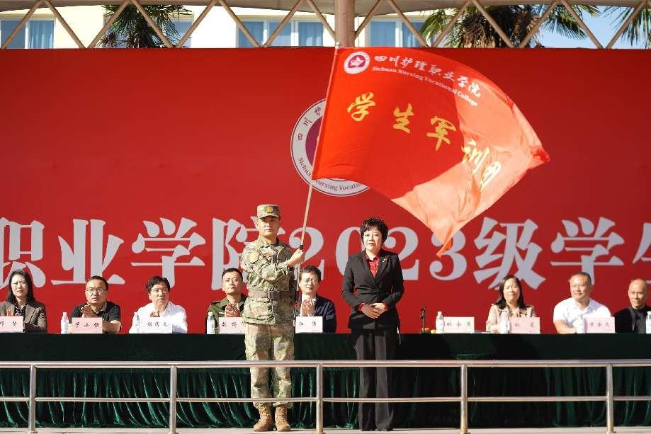 在嘹亮的军乐声中,张先庚院长向军训团授旗,并宣布学院2023级新生军训正式开始。