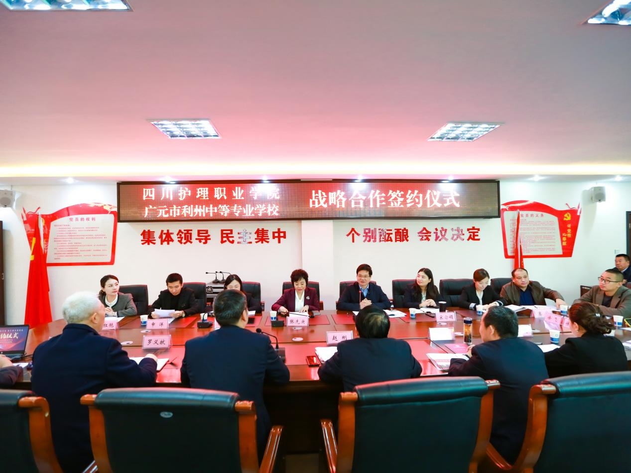 双方召开座谈会议,广元市利州中等专业学校党委书记赵刚等校领导以及全体中层干部参会。赵刚书记详细介绍了学校基本情况、发展现状和未来规划。他指出,beat365官方网站作为医药卫生类院校的领军院校,在治理体系、专业建设、发展路径等多方面形成了可复制、可借鉴的川护模式,希望双方深度合作,构建中高职院校合作新范式。梁小利副院长介绍了学院基本情况,她希望双方以本次交流为契机,建立常态化沟通机制。