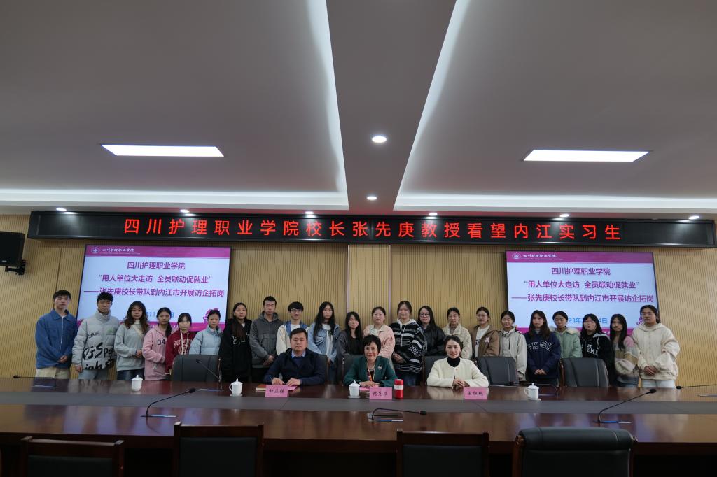 调研中,张院长一行积极开展访企拓岗,与内江地区实习的全体学生、实习医院领导老师进行了深入交流,全面了解同学们就业意向和需求,关心他们的实习收获、住宿、生活等。并提出三点希望,一是做好职业生涯规划,尤其要做好就业规划,以“四有川护生”为目标,快乐实习,不断提升为人与处事综合能力,为到祖国最需要的地方建功立业打好基础。二是全面提升专业水平,鼓励大家要珍惜实习的黄金时光,理论与实践结合提升专业知识与技能。三是弘扬“川护”大爱精神,在实习过程中,要争做情怀深、技能精、善创新、讲奉献的新时代卫生健康新人,为健康中国、健康四川做贡献。