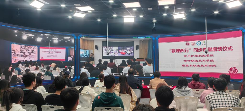 为积极响应教育部“慕课西行”号召,充分发挥以慕课为代表的数字技术与资源优势,推进优质教学资源共享,实现教育资源均衡,4月17日,学院依托智慧树在线教育平台,与喀什职业技术学院、塔里木职业技术学院约6000余名护理专业师生,横跨近4000公里,云端共享《老年护理学》国家级在线精品课程。学院院长张先庚、副院长梁小利,喀什职业技术学院副院长李新,塔里木职业技术学院院长助理张毅及相关部门、系部负责人参加了此次同步课堂的启动仪式。