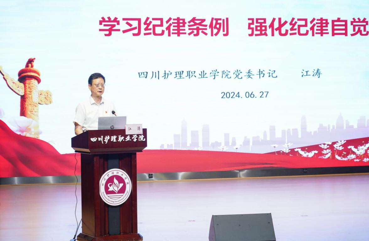 为深入学习贯彻习近平总书记关于全面加强党的纪律建设的重要论述,全面理解把握新修订的《中国共产党纪律处分条例》,切实增强遵规守纪的自觉,6月27日下午,学院党委书记江涛在成都校区面向全体党员讲授党纪学习教育专题党课。