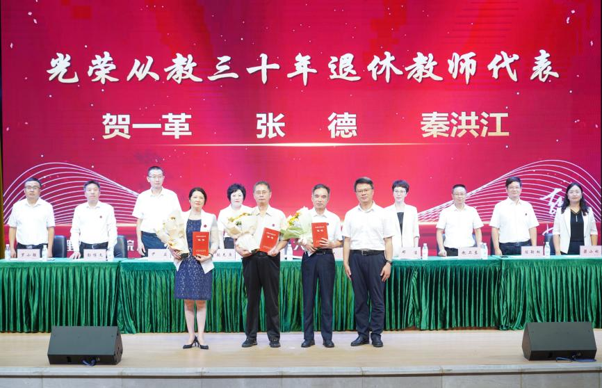 张先庚为从教30年在职教师代表颁发证书并献上鲜花