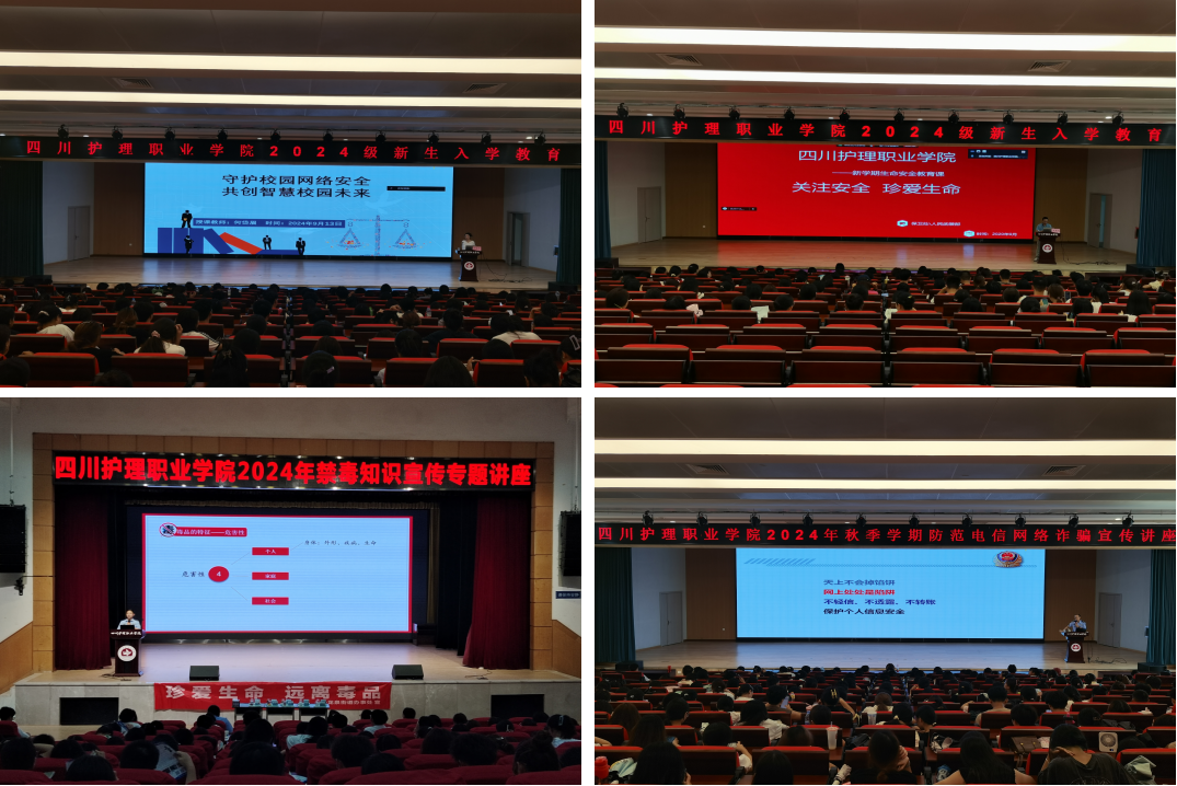 加强安全教育 筑牢安全底线。思政部教师何岱眉、保卫处教师李凌昊及两校区属地警官,结合精彩案例、法律法规,分别从“大学生网络安全、校园消防安全、禁毒知识、电信网络诈骗”四个方面,进行了细致讲解,全面提升了全体新生的安全意识与法治观念。