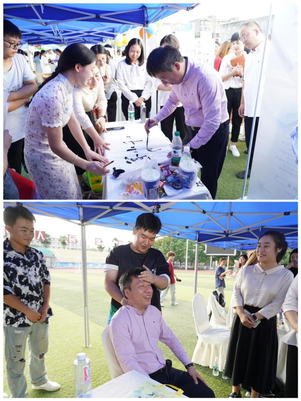 随后,领导和老师们走进各社团风采展示现场,指导活动开展,并体验推拿按摩,参观科创作品,感受非遗文化等,期间与社团学生亲切交流。