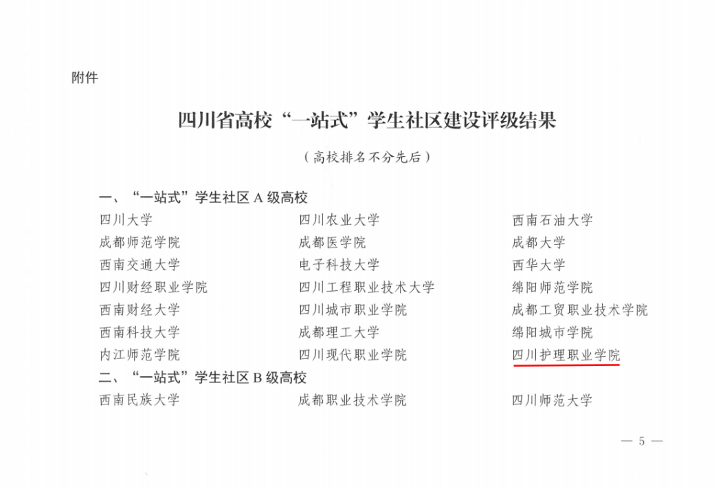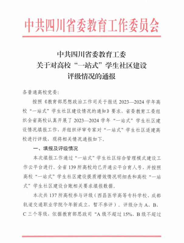 近日,中共四川省委教育工委公布了全省高校“一站式”学生社区评级结果,经申报、专家评审,学院“一站式”学生社区建设在全省139所参评本专科高校中脱颖而出,荣获A级评价,全省高校仅21所,高职院校仅5所获评A级。