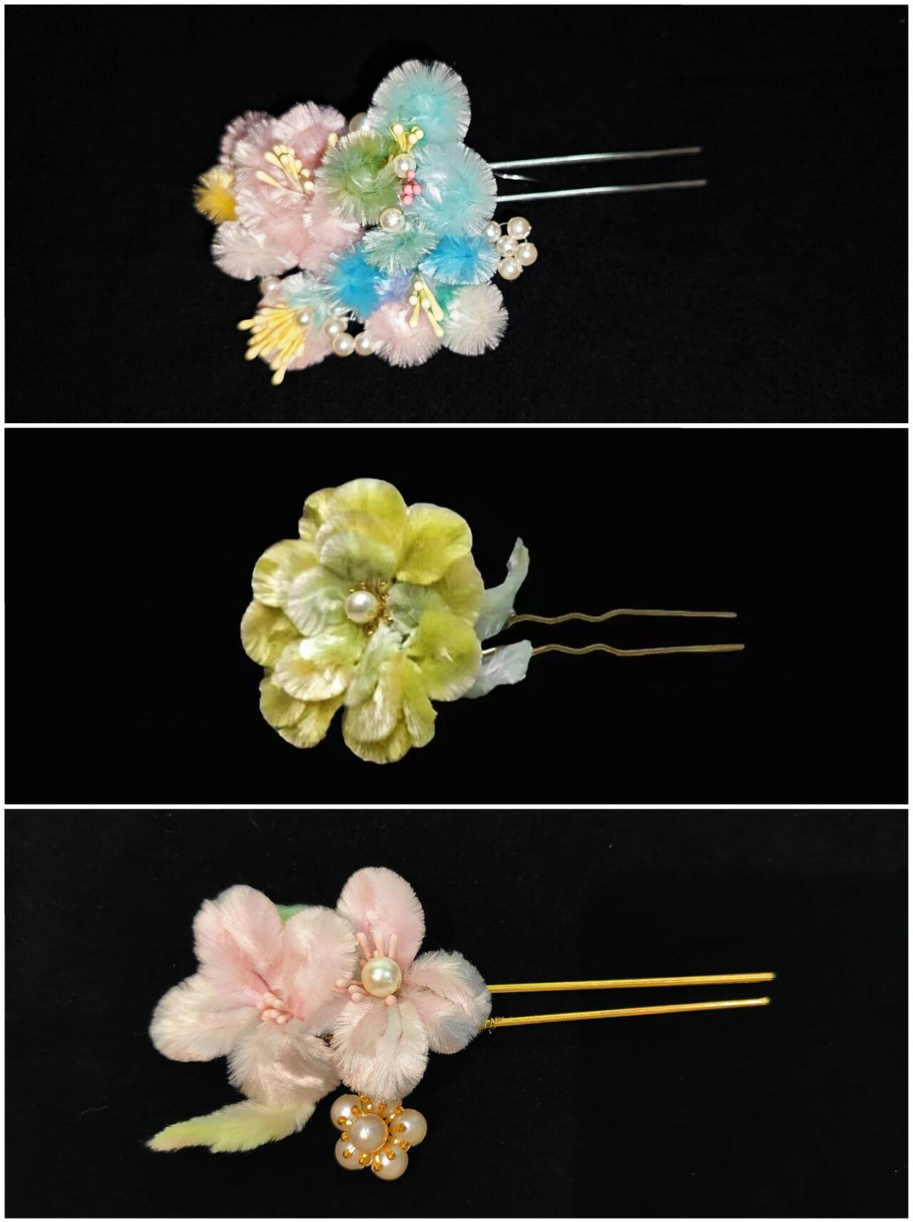 “从简开始”板块则更加注重绒花制作技艺。同学们将已经制作好的半成品绒条进行修剪、搭配与组装,并巧妙地将医学元素融入其中。他们利用所学的医学知识,将绒条修剪成象征医学之美的形状,如心形、十字形等,并与花蕊、花托等元素结合,制作出一支支独具匠心的非遗绒花钗子。这些作品不仅展示了同学们的创意与才华,更体现了非遗绒花与医学专业的完美融合与创新。