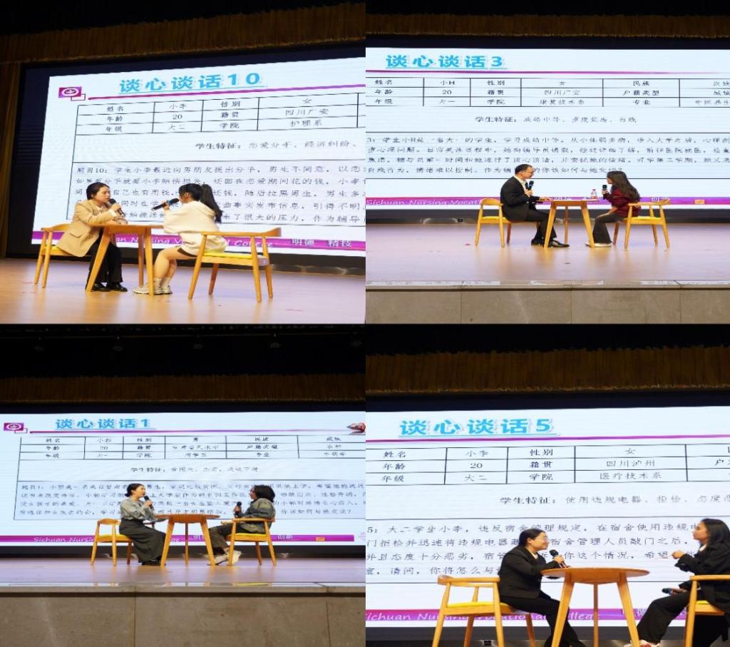 本次决赛对标省赛国赛要求由笔试排名前12位的辅导员参加,分谈心谈话和案例研讨两个环节。重点考察辅导员综合运用理论分析问题、研判问题,把握学生特征、遵循学生成长成才规律对学生教育引导及解决问题的能力,参赛选手除根据题目要求完成问题解答外,还需完成大赛评委现场提问。