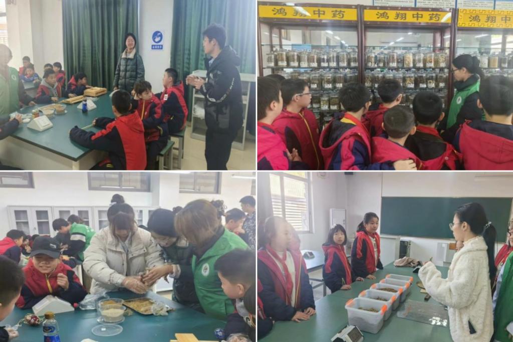 讲座结束后,学生们前往药学实训大楼,深入实训教室亲身实践体验,中药社团的大学生现场带领小学生们识别中药材种类、了解中药材炮制方法、制作中药香包、中药丸子等。