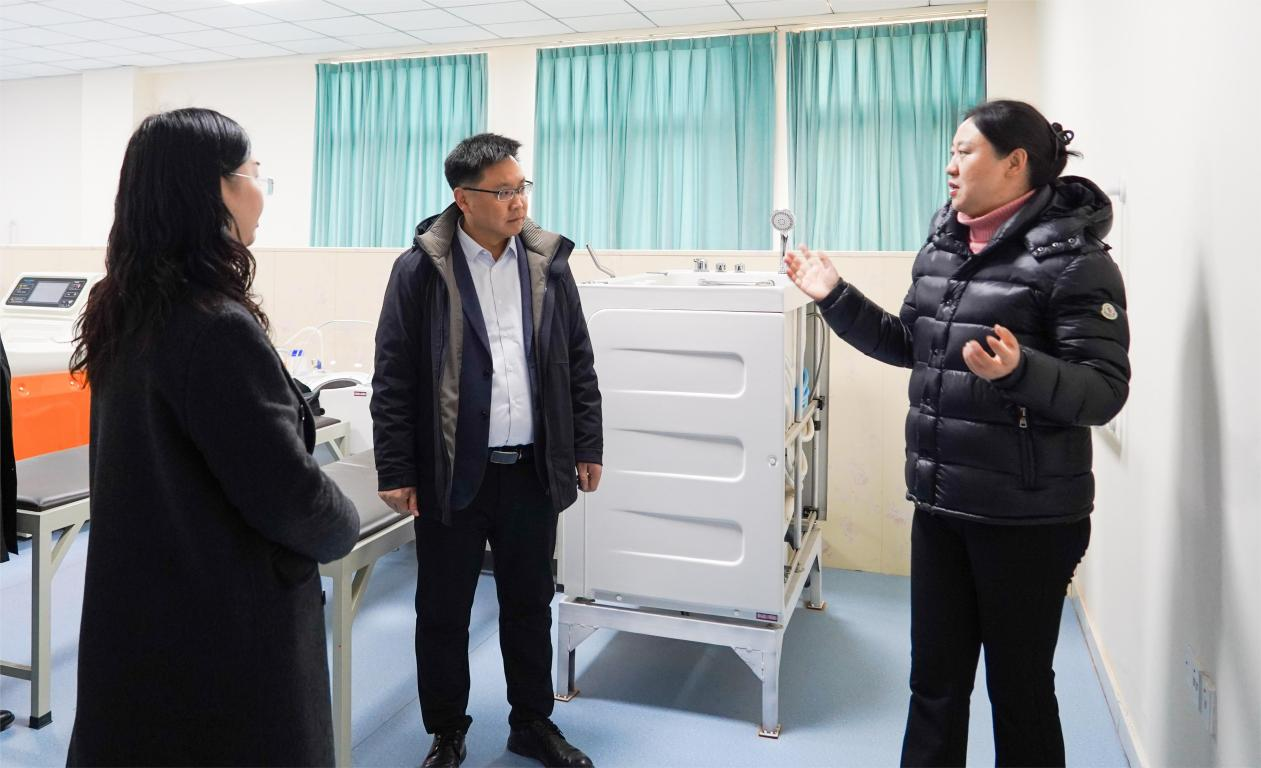 杨建强一行实地考察了护理实训中心,重点参观了国家级示范性虚拟仿真实训基地和智慧养老实训室,对学院办学条件、师资水平和校园环境给予了高度赞赏。