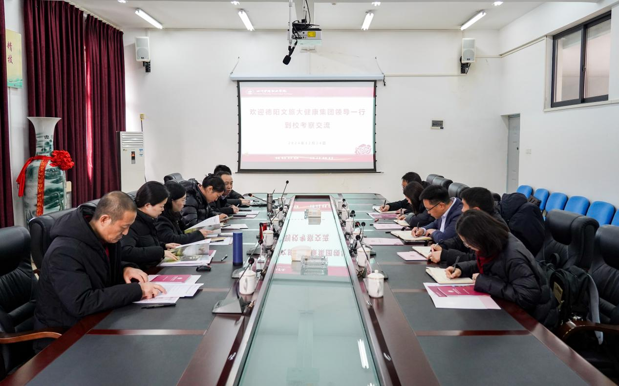 为加强产教深度融合,推动“委市共建”,整合资源促进学院与德阳卫生健康事业协同发展,12月24日,德阳文旅大健康集团(下称“集团”)党委书记、董事长杨建强一行到校考察交流,学院副院长梁小利出席,产教学院副院长李毅主持会议。