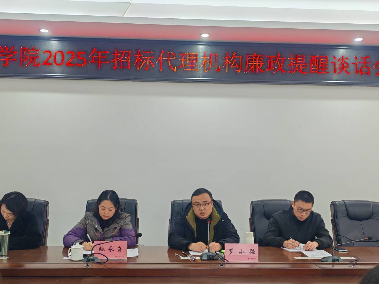 为强化招标采购领域廉政风险防控,营造公平透明的招投标环境,2月25日,学院在成都校区召开2025年招标代理机构廉政提醒谈话会。学院副院长姚永萍,党委副书记、纪委书记罗小强出席会议。纪委办公室、审计处负责人,国有资产处全体成员以及10家中标代理公司代表参会。