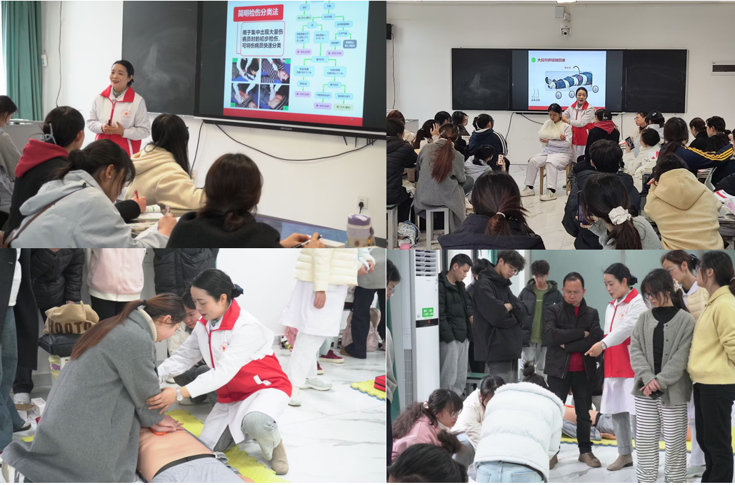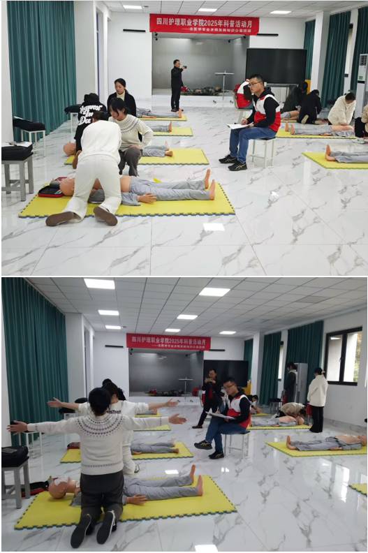 培训中,在德阳市红十字会资深讲师的监督下,学院护理系4名专业老师组成教学团队,结合真实案例与情景模拟,系统讲解应急救护的核心要点,重点围绕心肺复苏“黄金4分钟”的操作流程、自动体外除颤器(AED)使用规范、气道异物梗阻处置、创伤包扎及骨折固定等技能开展教学。通过图文并茂的讲解与互动问答,帮助学员深入掌握急救理论。